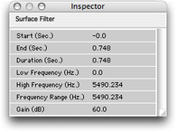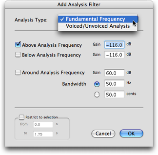 | “Analysis Filter” : filtres de type surface à partir de F0 et VUVIl s’agit là, de générer un ou plusieurs filtres à partir des analyses “Fundamental Frequency” ou “Voiced/Unvoived Analysis” précédemment faites. Une fois générés, ces filtres se comportent comme des filtres de type surface. Dans le menu “Treatments”, l'item “Add Analysis Filter...” ouvre le panneau proposant un certain nombre de choix. • Panneau de réglage Vous avez le choix du type d'analyse à utiliser comme Bpf : - “Fundamental Frequency”, - “Voiced/Unvoiced Analysis”. # Remarque : vous pouvez choisir chacun des types l'un après l'autre. Vous pouvez ensuite définir un ou plusieurs filtres : filtre couvrant la partie située : - soit au-dessus de la courbe fréquentielle de l'analyse (avec un gain à déterminer), - soit au-dessous de la courbe fréquentielle de l'analyse (avec un gain à déterminer), - soit autour de cette courbe (avec un gain à déterminer, ainsi qu'une largeur de bande en Hz ou en “cents” ). Vous pouvez aussi restreindre la portion de la courbe à utiliser avec “Restrict to selection”. ![]() Autant de surfaces sont générées par les filtres demandés, représentées sur une ou plusieurs pistes du séquenceur par autant d’éléments de piste de même durée portant l'icône filtre de type surface à main levée. Leur comportement est identique à celui des filtres de type surface : se reporter à la section : Points communs à toutes les surfaces (rectangle, libre et crayons). • L'inspecteur L'inspecteur de chacune des surfaces vous permet de modifier les paramètres de celle-ci. ![]() • Exemple ![]() Les trois types de filtres ont été générés à partir du VUF (avec restriction de chaque région : autour, en dessous et au dessus du VUF. ![]() Les trois filtres différents générés à partir du VUF • Autres modifications Vous pouvez déplacer ou redimensionner temporellement ou bien dupliquer le rectangle (donc le traitement) sur la piste de la même manière que pour les autres éléments. Les fonctions “Replicate in Time...” (menu “Edit”) et “Invert” (menu “Treatments”) sont actives. La fonction “Invert” change le signe du gain. Exemples sonores
