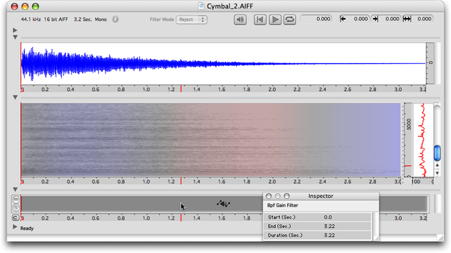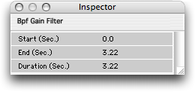 | “Breakpoint for Gain” : modification du gain variable dans le tempsDans le menu “Treatments”, l’item “Add Breakpoint for Gain…” ouvre l’éditeur de Bpf permettant définir la Bpf pilotant le changement de gain du signal en fonction du temps. Cette fenêtre (et donc la Bpf) est identifiée par le nom “son, type de Bpf, temps de début et temps de fin” : vous pouvez y dessiner et manipuler la Bpf représentant votre coefficient variable. Le nom de la fenêtre est utile pour l'identifier et la retrouver parmi vos nombreuses fenêtres ouvertes grâce au menu “Window”. • La Bpf L'axe horizontal représente le temps et l'axe vertical le gain en amplitude linéaire : 0 met le gain à 0 (donc silence) et 1 donne l'amplitude originale du son. ![]() La Bpf dans l'éditeur de Bpf # Remarque : Il est prudent de vérifier que la normalisation est activée en cas d’augmentation du gain. • La représentation sur le sonagramme et l'élément de piste L'élément de piste correspondant se place sur une piste du séquenceur. ![]() # Remarque : Sur le sonagramme se superpose une représentation colorée du gain. La couleur dépend de la valeur du gain : plus ou moins bleue pour une valeur positive et plus ou moins rouge pour une valeur négative. • Modification du traitement Pour modifier la Bpf, il faut réouvrir la fenêtre en double-cliquant sur l'élément de la piste. Les modifications se font comme pour toute Bpf. • L'inspecteur La palette “Inspector” donne accès aux paramètres : début, fin et durée. ![]() • Autres modifications Vous pouvez déplacer ou redimensionner temporellement ou bien dupliquer le rectangle (donc le traitement) sur la piste de la même manière que pour les autres éléments. Les fonctions “Replicate in Time...” et “Invert” sont actives. La fonction “Invert” donne la Bpf opposée. ![]() Gain inversé # Remarque importante : Il est prudent de vérifier que la normalisation est activée en cas d’augmentation du gain. |