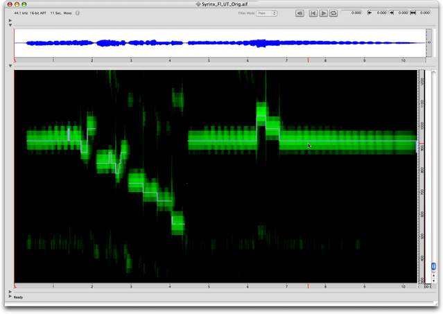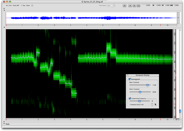 La Bpf s’affiche sur le sonagramme. On peut masquer l'affichage à volonté dans la palette “Sonogram Display” (voir section : La palette “Sonogram Display”). ![]() F0 sur le sonagramme affiché ![]() F0 sur le sonagramme caché Pour effacer la Bpf, il faut cliquer sur la courbe et appuyer sur la touche “Delete” (touche “←“ ou “Backspace”). Remarque : Il est possible d'utiliser la Bpf F0 pour fabriquer un filtre grâce à l'item "Add Analysis Filter…" du menu "Treatments" (voir section : Analysis Filter). Réglage de l'affichage de la Bpf sur le sonagramme