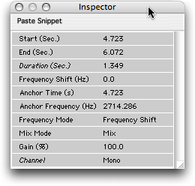 Afin de faciliter le positionnement précis d'un fragment (une région “temps/fréquence”) de son, le “Paste Snippet” possède un “Anchor Time and Frequency” (ancre en temps et en fréquence). Lorsqu'un nouveau “Paste Snippet” est créé en faisant glisser une région “temps/fréquence” sélectionnée ou lorsqu'un “Snippet” existant est déplacé, l'endroit où l'on clique, sur le sonagramme, définit ce point (en temps et fréquence) comme ancre du “Snippet”. Dans l'inspecteur, le temps et la fréquence des ancres peuvent êtres édités, et ainsi le déplacement d'un “Snippet” peut être contraint, non seulement par les limites en fréquence et temps, mais aussi relativement à l'ancre. Cela permet un contrôle plus fin sur le placement des partiels. ![]() “Anchor Time and Frequency” dans l'inspecteur L'inspecteur