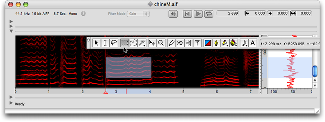 Sélection d'une région “temps/fréquence”, ici, avec l'outil rectangulaire : ![]() Suppression de la région “temps/fréquence”