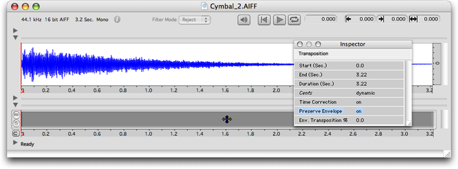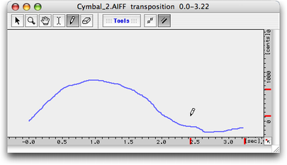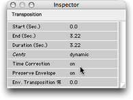 | “Dynamic Transposition” : transposition variable dans le tempsDans le menu “Treatments”, l’item “Add Dynamic Transposition…” ouvre l’éditeur de Bpf permettant définir le coefficient de transposition en fonction du temps. • La Bpf L'axe horizontal représente le temps et l'axe vertical, la transposition en “cents” (centième de 1/2 ton) ou en 1/2 ton. ![]() L'éditeur limite la transposition à + ou - 5 octaves, ce qui est considérable (réfléchissez à ce que vous voulez faire !). L'élément de piste correspondant se place sur une piste du séquenceur. • L'élément de piste ![]() • L’inspecteur La palette “Inspector” donne accès aux paramètres : début, fin et durée ainsi que correction temporelle et préservation de l'enveloppe spectrale. La préservation de l'enveloppe spectrale se fait en pourcentage. ![]() Il est possible de régler le mode avec ou sans correction de temps pour chacune des transpositions. Le choix se fait, pour chaque traitement, dans la fenêtre “Inspector” (par bascule on/off en face de “Time Correction”). Le même choix est possible pour “Preserve envelope”. • Modification du traitement Pour modifier la Bpf, il faut réouvrir la fenêtre en double-cliquant sur l'élément de la piste (ou la surface correspondante du sonagramme). Les modifications se font comme pour toute Bpf. Si plusieurs traitements par Bpf sont sélectionnés (identiques ou différents), seule la Bpf correspondant à l'élément de piste sur lequel vous double-cliquez s'ouvrira. • Autres modifications Vous pouvez déplacer ou redimensionner temporellement ou bien dupliquer le rectangle (donc le traitement) sur la piste de la même manière que pour les autres éléments. Les fonctions “Replicate in Time...” (menu “Edit”) et “Invert” (menu “Treatments”) sont actives. La fonction “Invert” donne la transposition opposée. Exemples sonores