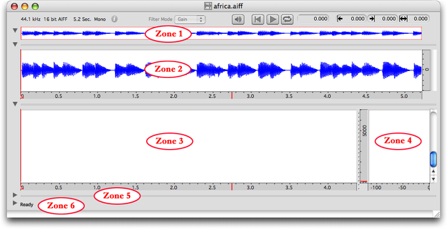 Cette fenêtre est redimensionnable de la manière habituelle (case, en bas, à droite). Outre la partie supérieure, elle comporte 6 zones.