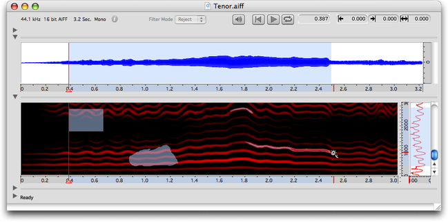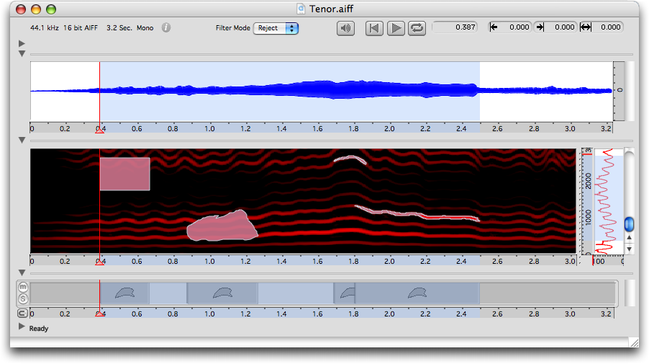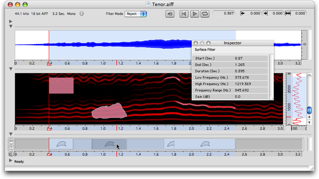 | “Filter From Selection” : filtres à partir de sélections temps/fréquenceLes régions sélectionnées en temps et fréquence sur le sonagramme peuvent être transformées en filtres surfaces à contenu fréquentiel. Il faut, d'abord, avoir défini une région ou un ensemble de régions temps/fréquence (voir section : Les régions “temps/fréquence”). • Les régions temps/fréquence ![]() • La représentation sur le sonagramme et l’élément de piste Puis, en utilisant l'item “Add Filter From Selection” du menu “Treatments”, cette ou ces régions se transforment en autant de filtres. Les zones sont maintenant colorées. ![]() En même temps, apparaissent sur la piste du séquenceur autant d’éléments de piste de même durée portant l'icône filtre de type surface à main levée. Il ne reste plus qu'à affecter un gain et un contour de la manière habituelle. Leur comportement est identique à celui des filtres de type surface : se reporter à la section : Filtrage par surface. ![]() • Modification du traitement La modification se fait en cliquant sur chacun des éléments de piste ou via l'inspecteur. L'inspecteur L'inspecteur de chacune des surfaces vous permet de modifier les paramètres de celle-ci. ![]() • Autres modifications Vous pouvez déplacer ou redimensionner temporellement ou bien dupliquer le rectangle (donc le traitement) sur la piste de la même manière que pour les autres éléments. Les fonctions “Replicate in Time...” et “Invert” sont actives. La fonction “Invert” change le signe du gain. • Définir des régions temps/fréquence La baguette magique ("Magic Wand") permet de définir des régions temps/fréquences différemment. Reportez-vous à la section ; L'outil baguette magique Exemples sonores