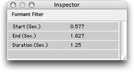 | “Constant Formant Filter” : filtre formantiqueUn filtre formantique est modelé sur les formants vocaux : il est donc formé de pics positifs. Si vous augmentez le gain d'un formant, tout est augmenté en proportion. De la même manière, si vous diminuez le gain d'un formant, tout est diminué en proportion. Dans le menu “Treatments”, faites “Add Constant Formant Filter...”. La boîte de dialogue “Formant Filter” s'ouvre et vous permet de choisir vos paramètres. • Panneau de réglage Vous pouvez donc choisir : - le nombre de formants (entre 1 et 5), - la tessiture ("Soprano", "Alto", "Countertenor", "Tenor" et "Bass"), - les voyelles. Dans chaque cas, pour chaque formant, les valeurs : - de la fréquence, - de l'amplitude, - et de la largeur de bande, vous sont proposées par défaut. Ces valeurs proviennent de la documentation de Csound : http://www.csounds.com/manual/html/MiscFormants.html Vous pouvez, bien entendu, utiliser d'autres valeurs, mais… ![]() Paramètrage du filtre formantique : choix du nombre de formants ![]() Choix de la tessiture ![]() Choix de la voyelle • L’élément de piste Sur une piste apparaît le rectangle de même durée portant l'icône correspondant au traitement (élément de piste). ![]() Filtre formantique et élément de piste • Modification des réglages Pour modifier le traitement, il faut réouvrir la boîte de dialogue en double-cliquant sur l'élément de la piste. Vous pouvez aussi modifier quelques paramètres de votre traitement en utilisant la palette “Inspector”. Mais vous n'avez accès qu'à la position temporelle et à la durée. • L'inspecteur ![]() • Autres modifications Vous pouvez déplacer ou redimensionner temporellement ou bien dupliquer le rectangle (donc le traitement) sur la piste de la même manière que pour les autres éléments. Seule la fonction “Replicate in Time...” (menu “Edit”) est active. La fonction “Invert” n'est pas active. Utilsations des filtres formantiques