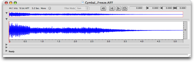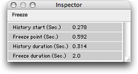 | “Freeze” : gel du son en un pointCe traitement s’applique en un point du son. Celui-ci se trouvera rallongé de la durée du “gel”. Ce n'est pas une simple lecture en boucle. En effet, ce “gel” s'appuie sur l'analyse de la portion du son qui précède le point d'application, portion du son appelée “History duration”. Il faut, au préalable, définir une sélection d'une partie du son de manière à ce que la fin de la sélection soit positionnée à l'endroit voulu du “gel”. Si vous ne le faites pas, le “gel” sera appliqué à la fin du son, avec toute la durée de celui-ci comme “historique” (“History duration”). Dans le menu “Treatments”, l'item “Add Freeze...” ouvre le panneau permettant de régler la durée du son “gelé”. • Panneau de réglage ![]() Panneau de réglage du “Freeze” • L’élément de piste La portion de son sur laquelle s'applique l'analyse pour ce “gel” est déterminée par la sélection (“History duration”). Ce “gel” s'applique à la fin de la sélection. En même temps apparaît sur une piste du séquenceur, le rectangle de même durée (“History duration”) portant l'icône correspondant au traitement (élément de piste). ![]() Freeze : élément de piste Le résultat : ![]() • Modification du traitement Pour modifier la durée du traitement, il faut réouvrir le panneau de réglage “Freeze” en double-cliquant sur l'élément de la piste. Pour modifier le traitement, il faut modifier la portion de son sur laquelle s'applique l'analyse pour ce “gel” est déterminée par la sélection (“History duration”). • L'inspecteur La palette “Inspector” permet de modifier les paramètres : point de départ de l'analyse (“History start”), endroit du gel (“Freeze point”), durée de l'analyse (“History duration”) et durée du gel (“Freeze duration”). ![]() • Autres modifications Vous pouvez déplacer temporellement ou bien dupliquer le rectangle (donc le traitement) sur la piste de la même manière que pour les autres éléments. # Attention : Redimensionner le rectangle change le traitement. La fonction “Replicate in Time...” (menu “Edit”) est active. La fonction “Invert” n'est pas active. Exemples sonores