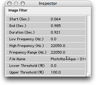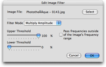 | “Image Filter” : filtrage par une imageIl s’agit de déposer une image sur tout ou partie du sonagramme et de l’utiliser comme filtre à niveau de gris en mode normal ou comme filtre à niveau de gris qui impose les amplitudes de l'image au son filtré. Dans le menu “Treatments”, l'item “Add Image Filter...” ouvre la fenêtre de dialogue standard permettant de naviguer dans l'arborescence des disques durs et d'y choisir une image (photo, dessin...) à importer. Celle-ci peut être en couleur ou en nivaux de gris au format JPEG, PICT, TIFF, PDF... tout format supporté par QuickTime. • La représentation sur le sonagramme et l'élément de piste L'image choisie s'affiche en nivaux de gris à l'endroit voulu sur le sonagramme. Celui-ci apparaît en transparence, vous permettant ainsi de mieux apprécier le traitement. ![]() Une photo sur le sonagramme et l'élément de piste Elle peut être déformée selon la région délimitée sur le sonagramme. Cette image a les mêmes propriétés qu'une surface rectangulaire : redimensionnement en hauteur et en largeur et déplacement en tout sens sur le sonagramme. En même temps apparaît sur une piste du séquenceur, le rectangle de même durée portant l'icône correspondant au traitement (élément de piste). Un double-clic sur l'élément de piste correspondant ouvre le panneau de réglage “Edit Image Filter”. • Panneau de réglage ![]() En haut, à gauche, on retrouve le nom de l’image choisie. A droite, le bouton “Select” permet de choisir une autre image. En dessous, il faut choisir le mode de filtrage : - “Multiply Amplitude” (fonctionnement normal d'un filtre) - “Replace Amplitude” (impose les amplitudes de l'image au son filtré). On retrouve les mêmes potentiomètres linéaires (“Upper Threshold” et “Lower Threshold”) que pour le “Clipping” permettant de régler les seuils de noir et de blanc. Par contre, les réglages par défaut (exprimés là en pourcentage) sont : 100 % pour “Upper Threshold” et 0 % pour “Lower Threshold”, respectant la dynamique de l'image. Si l'image ne couvre pas la totalité de la plage fréquentielle, les fréquences non recouvertes sont supprimées (réglage par défaut). L'option (case à cocher) “Pass frequencies outside of the image's frequency range” permet de ne pas les supprimer. # Remarque : Le menu déroulant, situé en haut de la fenêtre principale (gain, passe bande ou réjection de bandes) est inopérant. • Modification du traitement Pour modifier le traitement, il faut réouvrir le panneau de réglage “Edit Image Filter” en double-cliquant sur l'élément de la piste. • L'inspecteur Tous les paramètres sont aussi modifiables dans la palette “Inspector”, sauf le choix de l'image. ![]() • Autres réglages Vous pouvez déplacer ou redimensionner temporellement ou bien dupliquer le rectangle (donc le traitement) sur la piste de la même manière que pour les autres éléments. La fonction “Replicate in Time...” (menu “Edit”) est active. La fonction “Invert” (menu “Treatments”) est active : elle donne le négatif de l'image. ![]() La fonction “Invert” et le négatif de l'image Exemples sonores