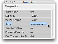 Ce traitement n'est pas un traitement pilotés par une Bpf traditionnelle. Il permet de faire des transpositions mélodiques à partir de rectangles d'annotations Midi (section : L'outil d'annotation par notes Midi et Annotation par notes Midi : outil et filtres) et, en particulier, à partir des annotations Midi générées par la Bpf F0 (Fréquence Fondamentale). Pour plus de détails, reportez-vous à la section : La Bpf F0 (Fréquence fondamentale). • Définition du traitement Il est donc nécessaire de calculer F0. Il est ensuite recommandé de faire le sonagramme pour vérifier la bonne correspondance de F0. ![]() Le sonagramme avec F0 et la grille Midi Vous définissez des notes Midi sur le sonagramme ; celles-ci (en fait, leur centre) serviront de références pour les transpositions. Ces notes Midi apparaissent sur une première piste. Ces annotations peuvent être ; - ajoutées à la main grâce à l'outil adéquat, - être générées à partir de F0, - ou encore provenir d'un fichier Midi (xxx.mid). Il ne faut oublier de définir la valeur de référence pour le La3 : MiddleA, par défaut 440 Hz (voir section : La grille). Pour faciliter les choses, il est conseillé d'utiliser la grille (soit en mode Midi, soit en mode "Staff") et de bien choisir entre échelle fréquentielle linéaire ou logarithmique (voir section : Les échelles). ![]() Les notes Midi et leurs éléments de piste ![]() Choix de la grille Le réglage de chaque note Midi peut se faire soit manuellement, soit via l'inspecteur concerné. ![]() L'inspecteur d'une note Midi Il faut choisir l'item "Add Melodic Transposition" du menu "Traitements", et sur une autre piste apparaît l'élément avec le symbole traditionnel de la transposition. Cela a pour effet de transformer chaque note Midi en transposition axée sur son centre. ![]() Si vous n'avez pas calculé F0, AudioSculpt vous en avertit. … et vous propose d'aller faire une telle analyse. ![]() Si vous n'avez pas mis d'annotations Midi, AudioSculpt vous en avertit. …et vous propose de générer celles-ci à partir de F0, à défaut d'autre choix. ![]() La transposition mélodique et son éléments de piste • Remarque Si il y a des marqueurs présents et visibles, "Quantize Fundamental Frequency" et "Generate Annotation from Fundamental Frequency" proposent d'utiliser ces marqueurs pour délimiter les notes. Si on choisit "No", l'arrondi et la génération d'annotation n'utilise pas ces marqueurs, et F0 sera donc à chaque instant arrondie vers le note la plus proche. Si, par contre, on choisit "Yes", une seule fréquence ou note sera définie entre deux marqueurs. ![]() • Nouvelle mélodie Les notes d'annotation définissent les hauteurs de note, et l'analyse F0 sert comme référence de la mélodie originale. Il suffit donc de déplacer ces notes d'annotation vers les hauteurs voulues pour créer une nouvelle mélodie. Il est facile d'utiliser les touches flèches pour déplacer les traitements et les caler grâce au magnétisme : chaque déplacement par une touche flèche provoque un saut vers le prochain point de repère magnétique. De plus, pomme + touche flèche droite ou gauche sélectionne le traitement précédent ou suivant sur la piste. • L'inspecteur de transposition mélodique On voit bien que le champ "Cents" indique "using annotation". Le réglage globale des transpositions concernées par cet élément de piste se fait via l'inspecteur. On peut y régler : - La durée, le début, la fin ; attention , il faut bien couvrir les notes Midi concernées. Ce paramétrage peut se faire manuellement. - Le mode avec ou sans correction de temps. Le choix se fait par bascule on/off en face de “Time Correction”). - Le mode avec ou sans transposition de l'enveloppe spectrale, si “Time Correction” est activé. Le choix se fait par bascule on/off en face de “Preserve Envelope”). - Le pourcentage de la valeur de la transposition de l'enveloppe spectrale. Attention, comme pour la transposition dynamique, cette valeur est en POURCENTAGE et non en cents. ![]() • Modification du traitement Pour modifier le traitement, vous pouvez agir : - sur les notes Midi, - sur les paramètres de la transposition, disponibles dans l'inspecteur de celle-ci. • Préservation des transitoires Dans le panneau de réglage ouvert par “Process Treatments...”, “Process Selection...” ou “Realtime Processing Settings...” (menu “Processing”), l'option “Transient Preservation” permet la détection des transitoires pour améliorer les transpositions. Cette option fonctionne avec des paramètres prédéfinis. La détection des transitoires n'est possible qu'en mode “Phase Synchronous Processing”. Reportez vous aux sections : Paramètres de la synthèse : “Synthesis Settings” et Détection et préservation des transitoires. # Remarque : Si plusieurs annotations se superposent, seule la transposition la plus grave est prise en compte. Ces rectangles peuvent être déplacés horizontalement et verticalement à l'aide des flèches "gauche, droites, haut, bas", pour plus de précisions. Cela permet, en utilisant le magnétisme, de déplacer les annotations pour les caler à la grille temporelle ou fréquentielle. Remarques à propos des annotations générées à partir de F0