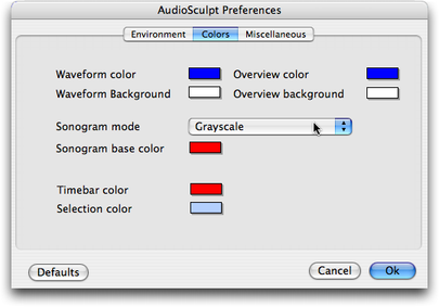 | Modes d'affichage du sonagrammePar défaut, le sonagramme s’affiche en niveaux de gris. Il est possible de choisir différents modes d'affichage en couleur. Dans le menu “AudioSculpt”, l'item “Preferences...” affiche le panneau “AudioSculpt Preferences” (voir section : Préférences). ![]() Menu AudioSculpt En choisissant “Colors”, le panneau ci-dessous s’ouvre : ![]() ![]() Préférences des couleurs d'affichage du sonagramme Il permet de déterminer le mode d’affichage voulu : - “Grayscale” (niveaux de gris, par défaut) ![]() Sonagramme en niveau de gris (échelle linéaire) ![]() Sonagramme en niveau de gris (échelle logarithmique) - “Colored Brightness” (la couleur choisie sur fond noir) ![]() Sonagramme en mode “Colored Brightness” (échelle linéaire) - rouge Dans ce cas, le bouton “Sonogram Base Color” ouvre la palette de couleurs standard Apple “Colors”, qui permet de choisir la couleur de base du sonagramme. ![]() Sonagramme en mode “Colored Brightness” (échelle linéaire) - vert - “Hot cold” ![]() Sonagramme en mode “Hot Cold” (échelle linéaire) - “Xspect” (mode cher aux utilisateurs d’Xspect) ![]() Sonagramme en mode “Xpect” (échelle linéaire) Dans tous les cas, les deux potentiomètres linéaires horizontaux (de la palette flottante “Sonogram Display”) permettent de régler la sensibilité de l’affichage. # Remarque : Vous pouvez toujours choisir entre un affichage linéaire ou logarithmique pour l'échelle fréquentielle (voir section : Les échelles). |
