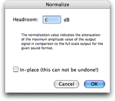 | NormalisationLa normalisation s’applique à la totalité du son. La fonction se trouve dans le menu et ouvre une boîte de dialogue qui permet de régler (en dB de puissance) la marge restant après normalisation. ![]() Après avoir défini votre paramètre, vous validez par OK. La fenêtre se referme et une fenêtre de dialogue standard s'ouvre demandant sous quel nom et à quel endroit vous désirez enregistrer le résultat (par défaut dans le dossier “Sounds”). Le choix fait, vous validez par OK. Cette fenêtre se referme et le calcul se lance. Une fois le calcul terminé, une nouvelle fenêtre AudioSculpt s'ouvre montrant le résultat (cette fenêtre porte le nom du nouveau son). La normalisation peut se faire “In-place” en cochant la case adéquate. Dans ce cas, elle s'applique au son original, donc le modifie, et ne peut être annulée. |