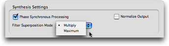 | Paramètres de la synthèse : “Synthesis Settings”![]() Phase Synchronous Processing (Synchronisation des phases) Ce paramètre (case à cocher) permet la préservation de la synchronisation des phases des sinusoïdes (pour les utilisateurs avertis : flag –P dans SuperVP) ; en général, ce processus améliore le résultat. Dans la représentation spectrale, les sinusoïdes sont distribuées sur plusieurs “bins”. Les différents “bins” qui appartiennent à la même sinusoïde doivent avoir des phases cohérentes pour que la sinusoïde garde son amplitude originale. Si la relation des phases n'est pas préservée, l'amplitude de la sinusoïde devient aléatoire, ce qui change le timbre du son résultant. Lors d'une dilatation ou d'une transposition, la qualité du résultat se dégrade fortement si la case “Phase Synchronous Processing” est décochée. Comme le temps de calcul n'est que légèrement augmenté par cette synchronisation des phases, il est vivement conseillé de laisser cette case cochée. Ne décochez la case Phase Synchronous Processing que si vous savez ce que vous faites. Normalize Output (Normaliser la sortie) Par défaut, la normalisation en sortie de traitement n'est pas activée. Il vous faudra donc faire attention lorsque vous appliquez des traitements qui augmentent le gain. Filter Superposition Mode (Mode de superposition des filtres) Le menu déroulant propose le choix entre les modes “Multiply” et “Maximum” pour le chevauchement des traitements qui modifient le gain (filtres surfaces, filtres bande, filtres breakpoint et filtres formantiques).