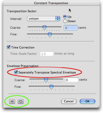 | “Constant Transposition” : transposition constanteDans le menu “Treatments”, faites “Add Constant Transposition…”. La boîte de dialogue suivante s’ouvre et vous permet de choisir vos paramètres. • Panneau de réglage ![]() Panneau de réglage pour la transposition constante avec correction temporelle Le choix préalable de “Up” ou “Down” détermine le signe de la transposition. Le choix se fait : - en intervalle (par menu déroulant), - ou en “cents” (centième de demi-ton) par potentiomètres linéaires. Le premier (“Coarse”) agit par pas de 100 “cents” (un demi-ton). Le second (“Fine”) agit par pas de 1 “cents” pour un réglage fin. ![]() Réglage de la transposition par le facteur de dilatation/compression • Correction temporelle (“Time Correction”) Une case à cocher vous permet d'opter pour la correction temporelle ou non (correction temporelle : “Time Correction”, cochée par défaut). En dessous, “Time-Scale Factor” (facteur de dilatation/compression) indique la valeur pour obtenir la même transposition sans correction temporelle. Si vous désactivez la correction temporelle, le champ devient accessible, permettant de définir la transposition correspondante (la valeur en “cents” s'affiche dans la partie “Transposition Factor”. • Préservation de l'enveloppe spectrale (“Envelope Preservation”) Si vous optez pour la correction temporelle (“Time Correction”), vous pouvez choisir la préservation de l'enveloppe spectrale ou non (“Envelope Preservation” est coché par défaut). L'enveloppe spectrale peut être transposée ou préservée indépendamment. La transposition de l'enveloppe spectrale se règle à l'aide de deux potentiomètres linéaires. Le premier (“Coarse”) agit par pas de 100 “cents” (un demi-ton). Le second (“Fine”) agit par pas de 1 “cents” pour un réglage fin. La transposition elle-même est découplée de la transposition de l'enveloppe spectrale du son. Cela permet ainsi de ne transposer que l'enveloppe spectrale, si on le désire. Il suffit de mettre à zéro la transposition et de ne régler que la transposition de l'enveloppe spectrale. ![]() • Pré-écoute en temps réel Pour faciliter la réglage des paramètres de transposition, une pré-écoute en temps réel est disponible : elle est commandée par les deux boutons en bas à gauche du panneau (lecture et boucle). # Remarque : la version dynamique (transposition par Bpf) fonctionne différemment avec une préservation par pourcentage. • L'inspecteur Tous ces réglages sont disponibles dans la fenêtre “Inspector”. ![]() L'inspecteur de transposition constante # Remarque : La transposition est limitée à + ou - 5 octaves, ce qui est considérable. • L'élément de piste En même temps apparaît sur une piste du séquenceur, le rectangle de même durée portant l'icône correspondant au traitement (élément de piste). ![]() Transposition : élément de piste • Modification du traitement Pour modifier la transposition, il faut réouvrir la boîte de dialogue en double-cliquant sur l'élément de la piste. Si plusieurs traitements de ce type s'appliquent au même son, il est possible de régler pour chacun d'eux individuellement : - le mode avec ou sans correction de temps pour chacune des transpositions. Le choix se fait, pour chaque traitement dans la boîte de dialogue habituelle ou dans la fenêtre “Inspector” (par bascule on/off en face de “Time Correction”). - le mode avec ou sans transposition de l'enveloppe spectrale, si “Time Correction” est activé. Le choix se fait, pour chaque traitement dans la boîte de dialogue habituelle ou dans la fenêtre “Inspector” (par bascule on/off en face de “Preserve Envelope”), ainsi que la valeur la transposition y afférant. - tous les autres paramètres sont réglables de même. • Préservation des transitoires Dans le panneau de réglage ouvert par “Process Treatments...”, “Process Selection...” ou “Realtime Processing Settings...” (menu “Processing”), l'option “Transient Preservation” permet la détection des transitoires pour améliorer les transpositions (ainsi que les dilatations/compressions). Cette option fonctionne avec des paramètres prédéfinis. La détection des transitoires n'est possible qu'en mode “Phase Synchronous Processing”. Reportez vous aux sections : Paramètres de la synthèse : “Synthesis Settings” et Détection et préservation des transitoires. • Autres modifications Vous pouvez déplacer ou redimensionner temporellement ou bien dupliquer le rectangle (donc le traitement) sur la piste de la même manière que pour les autres éléments. Les fonctions “Replicate in Time...” (menu “Edit”) et “Invert” (menu “Treatments”) sont actives. La fonction “Invert” change le signe de la transposition. Exemples sonores