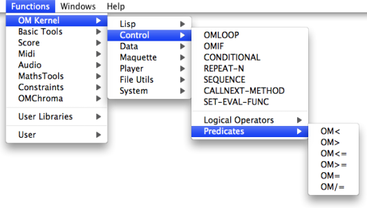 Here is a list of OM and Lisp predicates. Like other functions, they can also be added in a patch editor by typing their name directly. Equivalent Lisp predicates can be added directly in a patch editor.