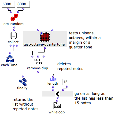 The resulting list is returned to remove-dup, which removes equal values and octaves, give or take a quarter tone.