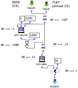 Usually, remove-dup checks if two values are strictly equal. We have modified this predicate with a lambda patch. Indeed, here is what happens if two pitches make almost an octave – 1200 midicents : | ![]() |