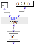 For instance, apply is a higher-order Lisp function that applies a functional argument, which must be a function, to a second argument, which must be the elements of a list. Here, apply applies + to a list of four numbers. | ![]() |
